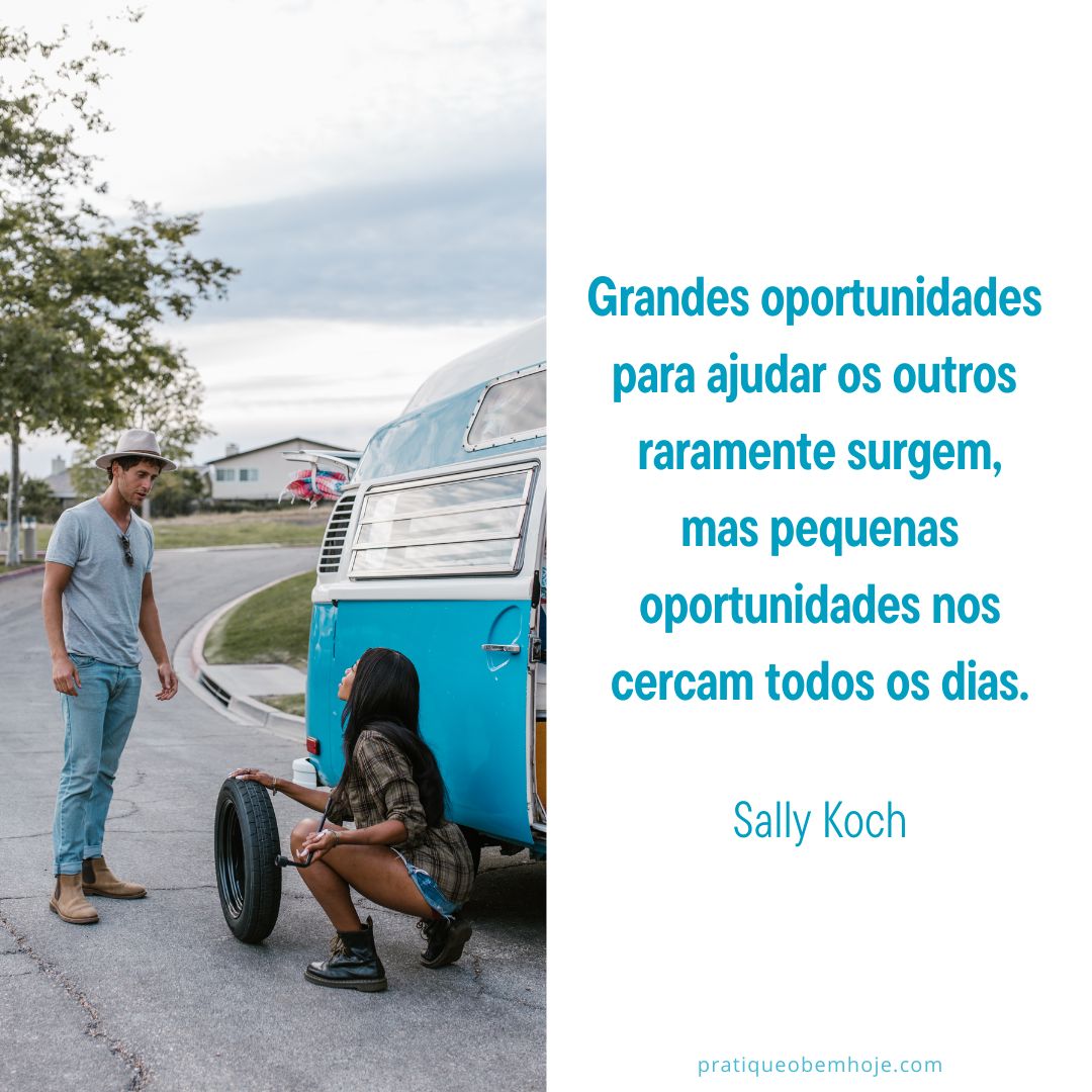 Oportunidades 4 de janeiro de 2023 / Pedro Wanderley Grandes oportunidades para ajudar os outros raramente surgem, mas pequenas oportunidades nos cercam todos os dias. – Sally Koch Great opportunities to help others seldom come, but small ones surround us every day. – Sally Koch Compartilhe isso: Clique para compartilhar no X(abre em nova janela) 18+ Clique para compartilhar no Facebook(abre em nova janela) Facebook Curtir Carregando... Relacionado